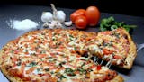 Tomato sauce, fresh mozzarella, fresh chopped basil and tomatoes, on our thin seasoned light crust.